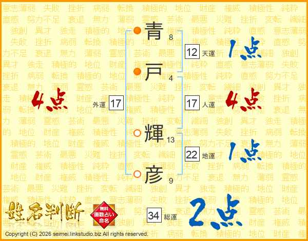 青(8画)戸(4画) 輝(13画)彦(9画)