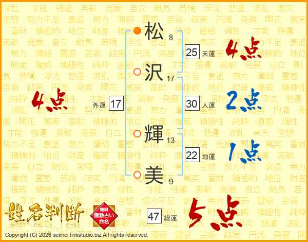 松(8画)沢(17画) 輝(13画)美(9画)
