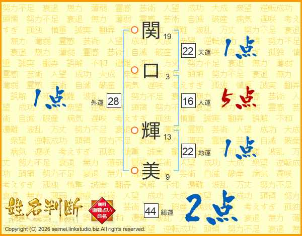 あなたの人生を表す1番重要な運勢です。生涯を通じて影響する総合運となり、主に50歳以降の晩年期に影響を及ぼします。苗字と名前の合計画数。