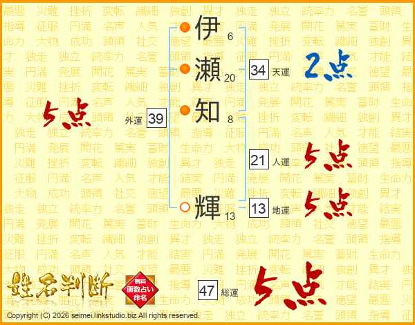 伊瀬知輝さんの総運は47画の5点!