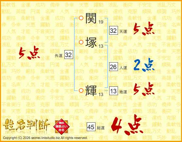 生活面を象徴する運勢です。外部から受ける影響力を表し、結婚運、家庭運や職場、環境への順応性を表します。総運から人運を引いた画数。姓や名が1文字の場合を除く。