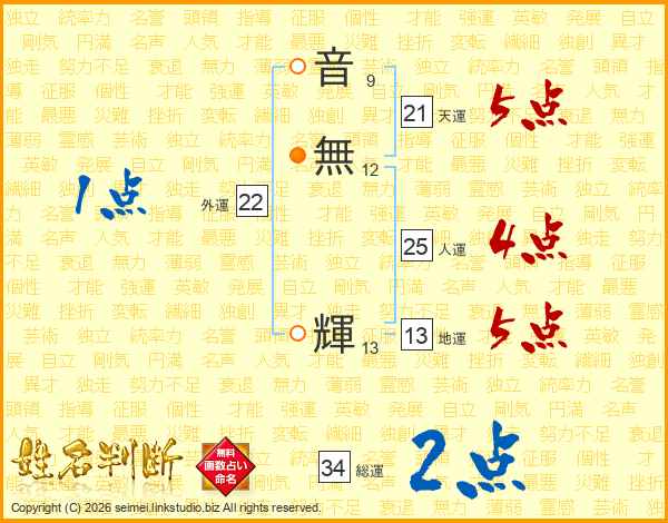 音(9画)無(12画) 輝(13画)