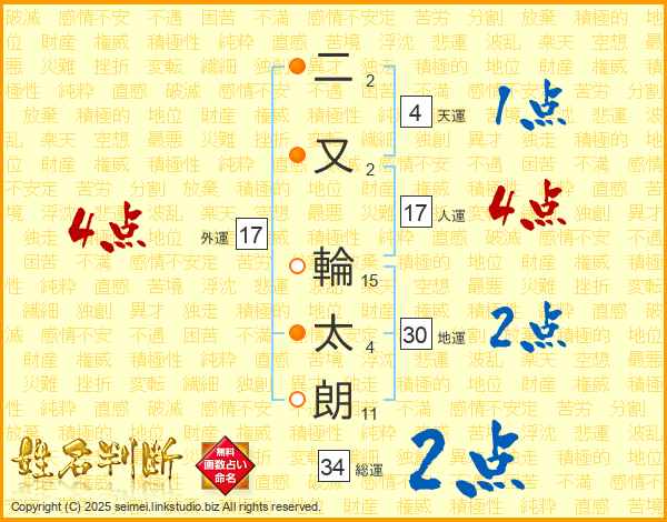 二(2画)又(2画) 輪(15画)太(4画)朗(11画)