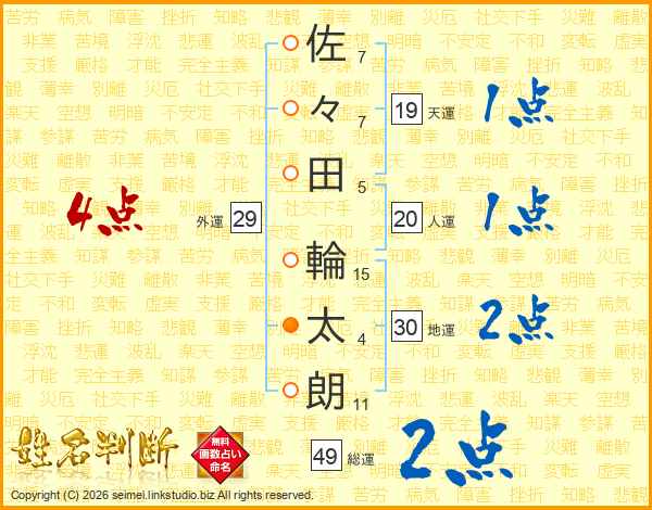 佐(7画)々(7画)田(5画) 輪(15画)太(4画)朗(11画)