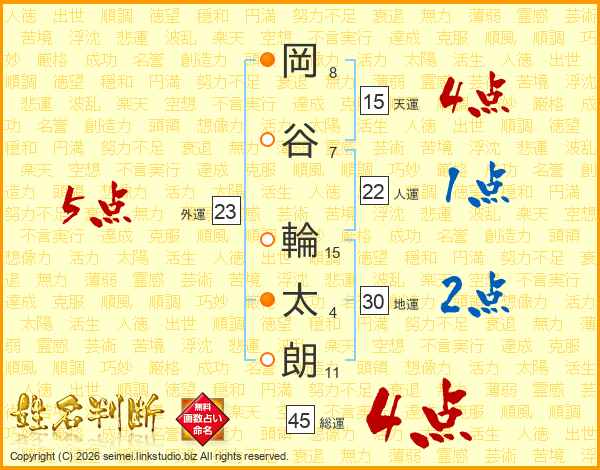 岡(8画)谷(7画) 輪(15画)太(4画)朗(11画)