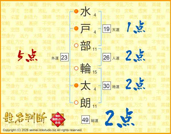 水(4画)戸(4画)部(11画) 輪(15画)太(4画)朗(11画)