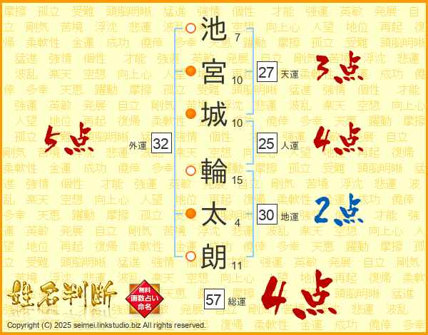 池(7画)宮(10画)城(10画) 輪(15画)太(4画)朗(11画)