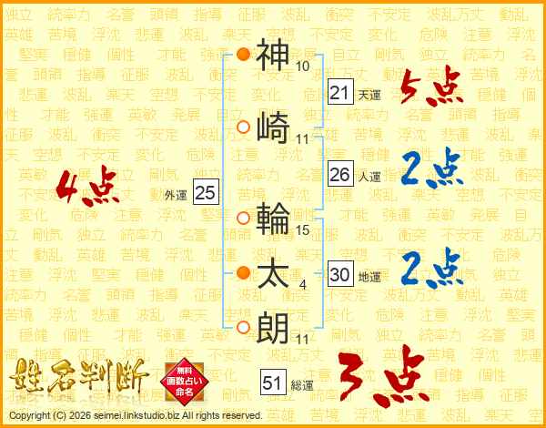 神(10画)崎(11画) 輪(15画)太(4画)朗(11画)