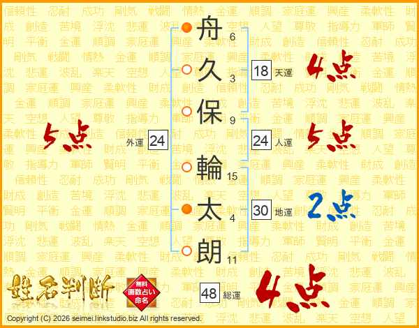 舟(6画)久(3画)保(9画) 輪(15画)太(4画)朗(11画)