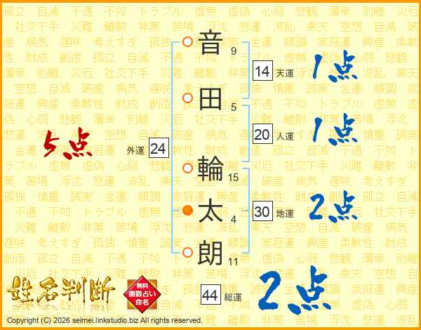 音(9画)田(5画) 輪(15画)太(4画)朗(11画)