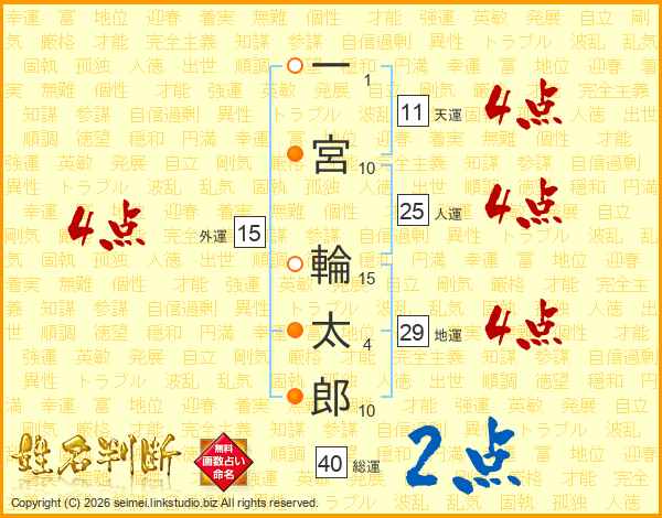一(1画)宮(10画) 輪(15画)太(4画)郎(10画)