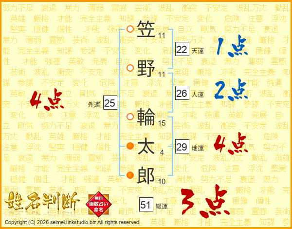 笠(11画)野(11画) 輪(15画)太(4画)郎(10画)
