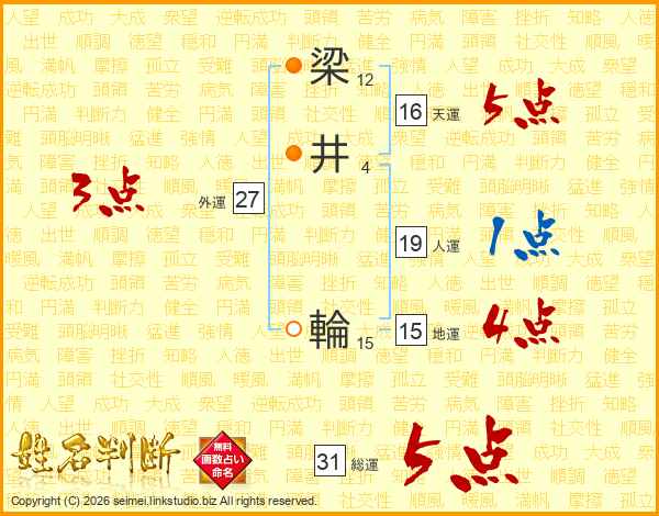 生活面を象徴する運勢です。外部から受ける影響力を表し、結婚運、家庭運や職場、環境への順応性を表します。総運から人運を引いた画数。姓や名が1文字の場合を除く。