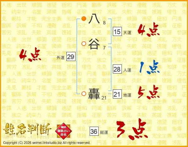 生活面を象徴する運勢です。外部から受ける影響力を表し、結婚運、家庭運や職場、環境への順応性を表します。総運から人運を引いた画数。姓や名が1文字の場合を除く。