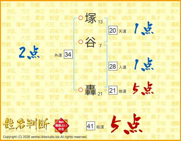 生活面を象徴する運勢です。外部から受ける影響力を表し、結婚運、家庭運や職場、環境への順応性を表します。総運から人運を引いた画数。姓や名が1文字の場合を除く。
