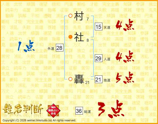 家系が持つ宿命的な運勢を表します。祖先から受け継いだ苗字ですので自分の力が及びません。家柄を象徴します。苗字の合計画数。
