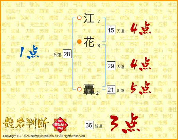 生活面を象徴する運勢です。外部から受ける影響力を表し、結婚運、家庭運や職場、環境への順応性を表します。総運から人運を引いた画数。姓や名が1文字の場合を除く。