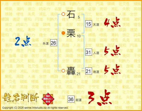 家系が持つ宿命的な運勢を表します。祖先から受け継いだ苗字ですので自分の力が及びません。家柄を象徴します。苗字の合計画数。