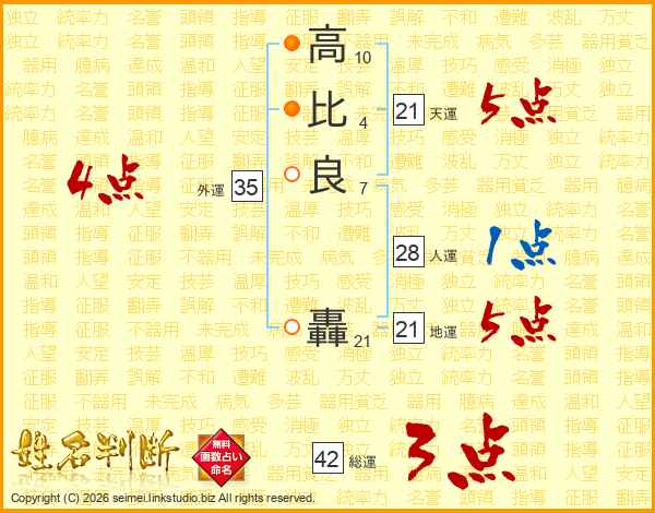 生活面を象徴する運勢です。外部から受ける影響力を表し、結婚運、家庭運や職場、環境への順応性を表します。総運から人運を引いた画数。姓や名が1文字の場合を除く。