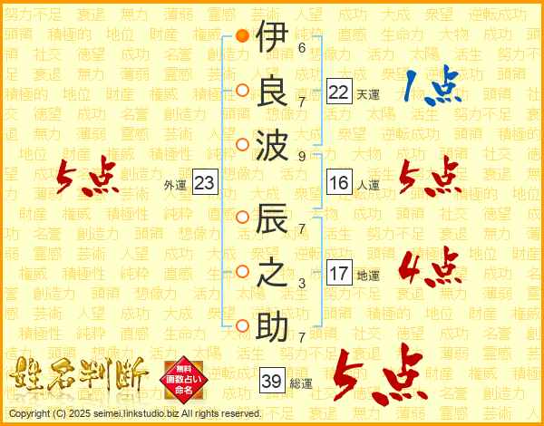 伊(6画)良(7画)波(9画) 辰(7画)之(3画)助(7画)