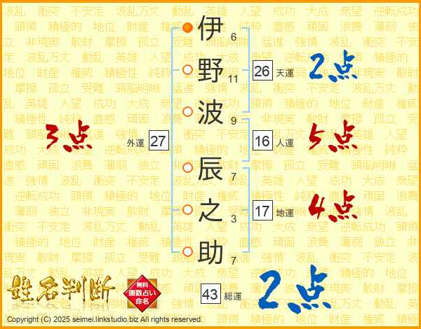 伊(6画)野(11画)波(9画) 辰(7画)之(3画)助(7画)