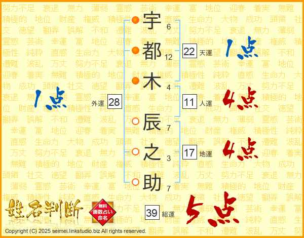 宇(6画)都(12画)木(4画) 辰(7画)之(3画)助(7画)