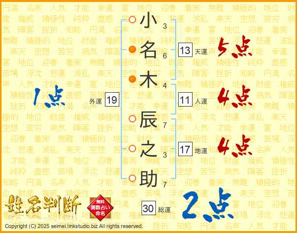 小(3画)名(6画)木(4画) 辰(7画)之(3画)助(7画)