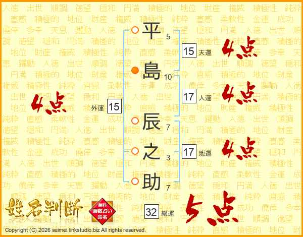 平(5画)島(10画) 辰(7画)之(3画)助(7画)