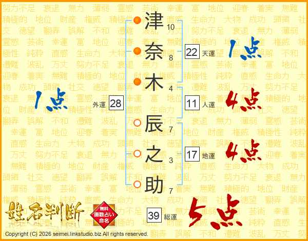 津(10画)奈(8画)木(4画) 辰(7画)之(3画)助(7画)