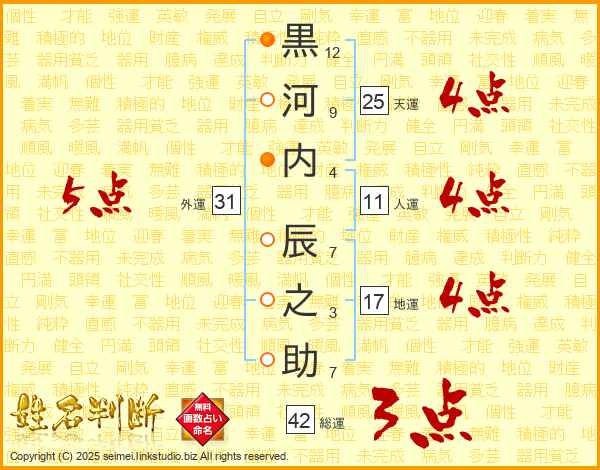 黒(12画)河(9画)内(4画) 辰(7画)之(3画)助(7画)