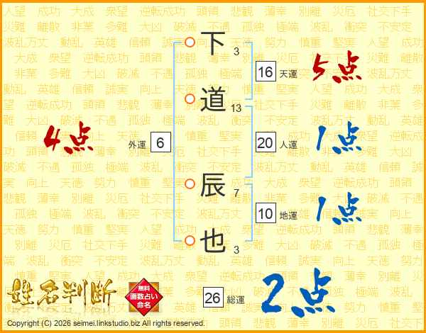 下道辰也さんの総運は26画の2点!