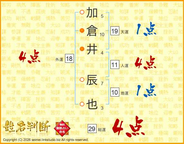 加(5画)倉(10画)井(4画) 辰(7画)也(3画)