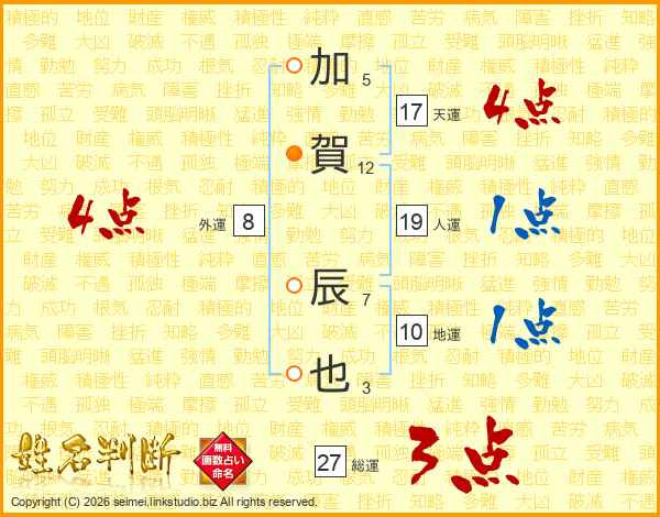 生活面を象徴する運勢です。外部から受ける影響力を表し、結婚運、家庭運や職場、環境への順応性を表します。総運から人運を引いた画数。姓や名が1文字の場合を除く。