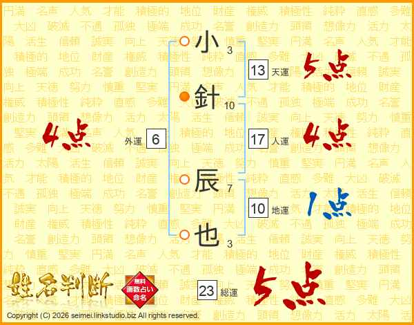 小針辰也さんの総運は23画の5点!