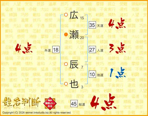 広(15画)瀬(20画) 辰(7画)也(3画)
