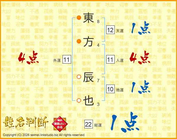生活面を象徴する運勢です。外部から受ける影響力を表し、結婚運、家庭運や職場、環境への順応性を表します。総運から人運を引いた画数。姓や名が1文字の場合を除く。