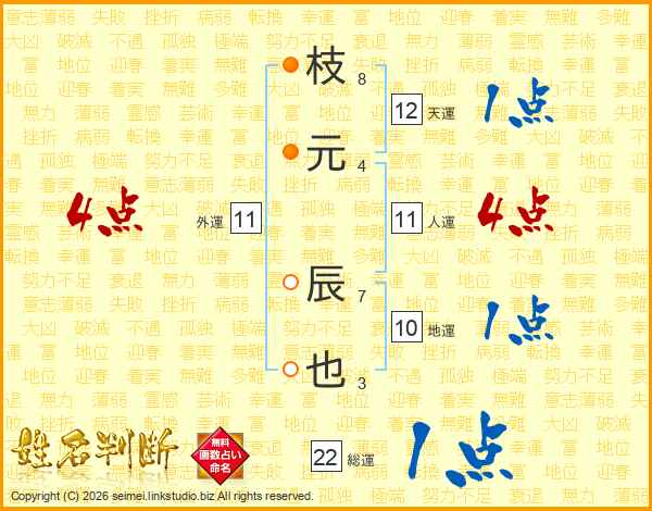 生活面を象徴する運勢です。外部から受ける影響力を表し、結婚運、家庭運や職場、環境への順応性を表します。総運から人運を引いた画数。姓や名が1文字の場合を除く。