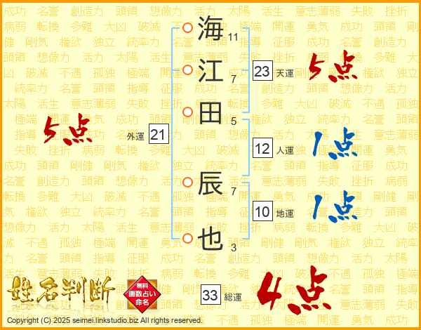海(11画)江(7画)田(5画) 辰(7画)也(3画)
