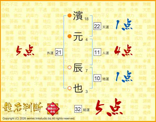 生活面を象徴する運勢です。外部から受ける影響力を表し、結婚運、家庭運や職場、環境への順応性を表します。総運から人運を引いた画数。姓や名が1文字の場合を除く。