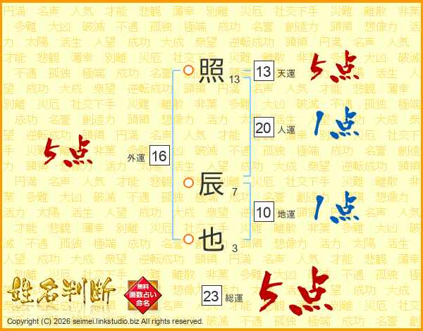 照辰也さんの総運は23画の5点!