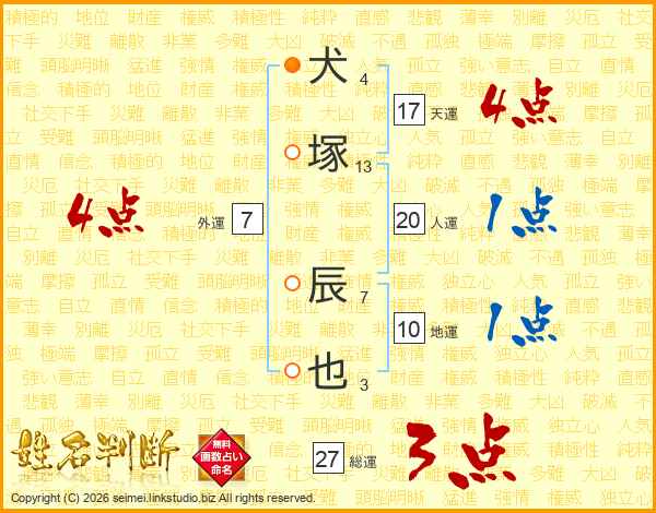 犬(4画)塚(13画) 辰(7画)也(3画)