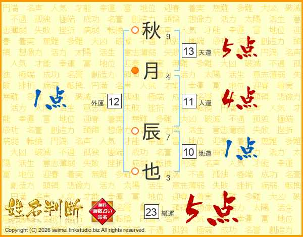 秋月辰也さんの天運は13画の5点!