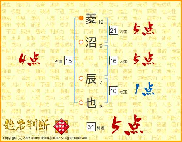 菱(12画)沼(9画) 辰(7画)也(3画)