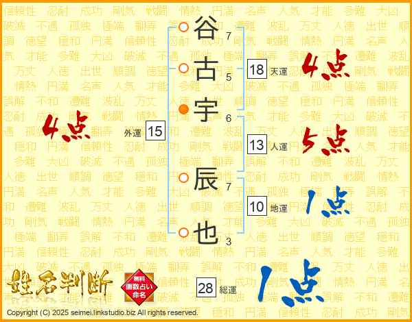 谷(7画)古(5画)宇(6画) 辰(7画)也(3画)