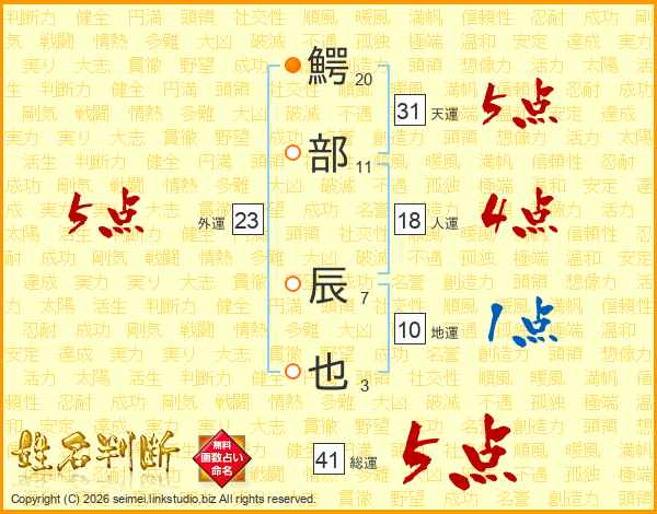 鰐部辰也さんの総運は41画の5点!