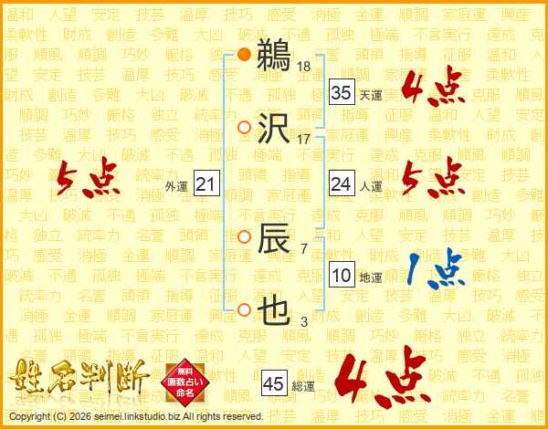 鵜(18画)沢(17画) 辰(7画)也(3画)
