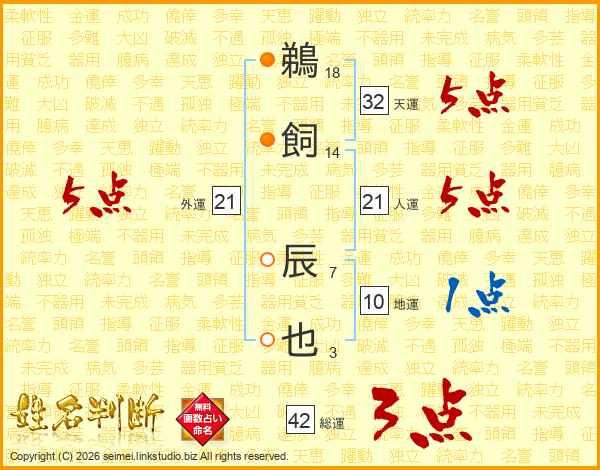 鵜(18画)飼(14画) 辰(7画)也(3画)