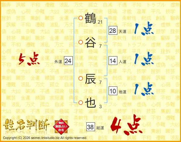 鶴(21画)谷(7画) 辰(7画)也(3画)