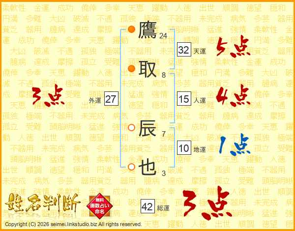 鷹(24画)取(8画) 辰(7画)也(3画)