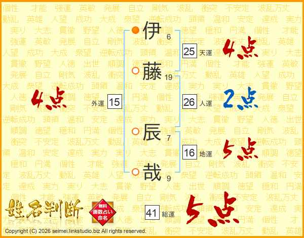 伊(6画)藤(19画) 辰(7画)哉(9画)